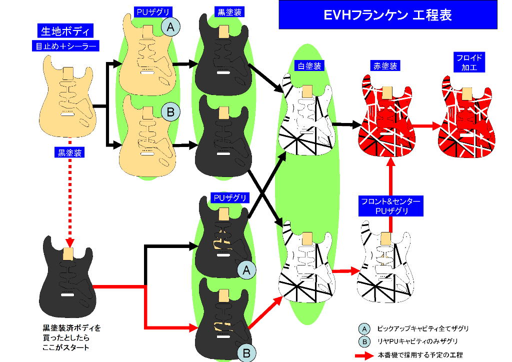| フランケンの作成工程について、正しくは真相は「エディのみぞ知る」としか言い様が無い。それを言ったらオシマイだが、そこを探るのが面白い! @ボディを入手した時は生地だったのか、黒まで塗ってあったのか?(その為に下図は「購入」が2箇所になっている) A白黒期のピックアップのザグリは、リヤだけか、3ポジションとも一気にやってあったか? この2つがハッキリするだけで工程が確定される。それまでは考えられる工程は下記の通り。 とりあえず私は赤矢印に従って進めたいと思う。 |