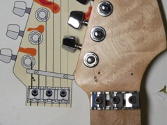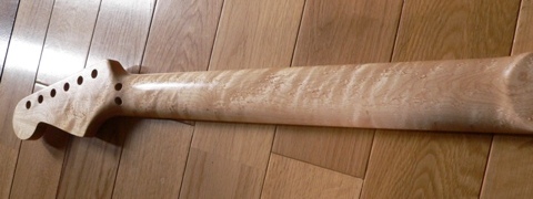 今回、極上のネックを入手した。 見事な指板上のクッキリとしたバーズアイ、 未塗装で撮影角度に気を遣わなくても現れる裏面のトラ目。 20年前のデッドストック材との事。 今回の仕様はエディに倣って、 ・スモールヘッド ・貼りメイプル ・ローズウッドポジションマーク+狭間隔12F ・Uシェイプ→後にCシェイプに変更 ・ジムダンロップ6000フレット ・ナット幅44mm |