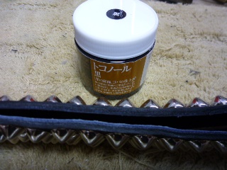 | 革の側面にトコノールを塗布。 縁を黒くするのが目的。 こすると艶も出るらしい。 |