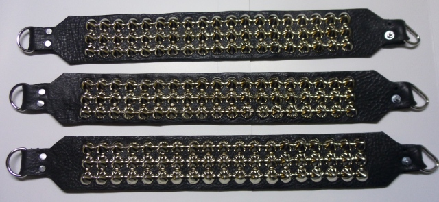 | チェーンを13駒に切り出し、片方に曲げた針金を通す。 針金を曲げたところで書いた針金の切り口のヤスリかけも こんな感じに仕上がってます。 写真は通している最中。 皮革部との結合で、ここに皮革のD環が通るので途中で止めた 方が楽。 皮革部と結合してしまっても良いです。 |