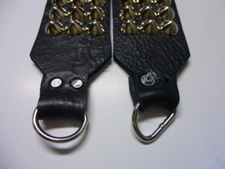 | 表側はこうなる。 ボディエンド側がなぜボルト固定なのか? 固定部からD環を通すループまでが、ネック側よりも短い。 という事は、 何らかの破損があってリベットが取れた+皮が破れた (犬が原因か、ギターが原因かは全く不明w) で、リベット用穴が使えなくなったので新たに穴を空けてボルトを 通して固定した。 エディがやりそうなテキトーな処置だから、大方合っていると思う。 |