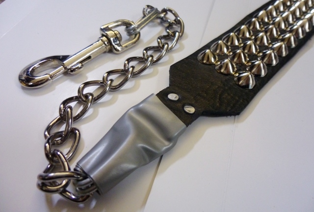 @チェーン A黒い革(表用と裏用の2枚) Bスタッズ、57個 C各種ナスカン D針金 E各種テープ |